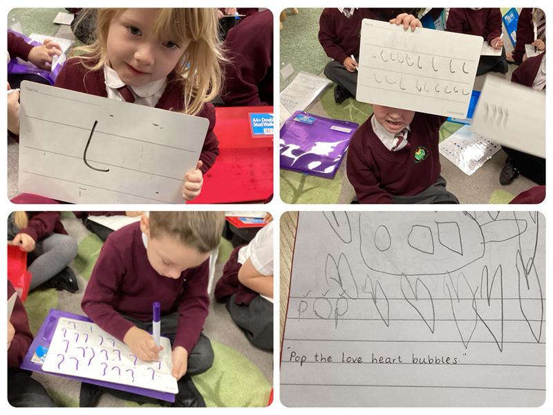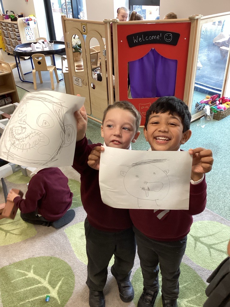 In Drawing Club last week, Miss Matthews shared a clip called ‘Bubbles’ from the original Magic Roundabout. We learnt what the word ‘greeting’ means, and we have been practising this when seeing our friends and visitors in the classroom. We drew Zebedee, Mr Rusty's house, and we invented the characters' a new bubble machine.