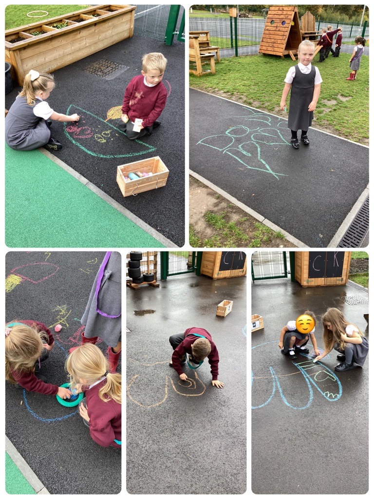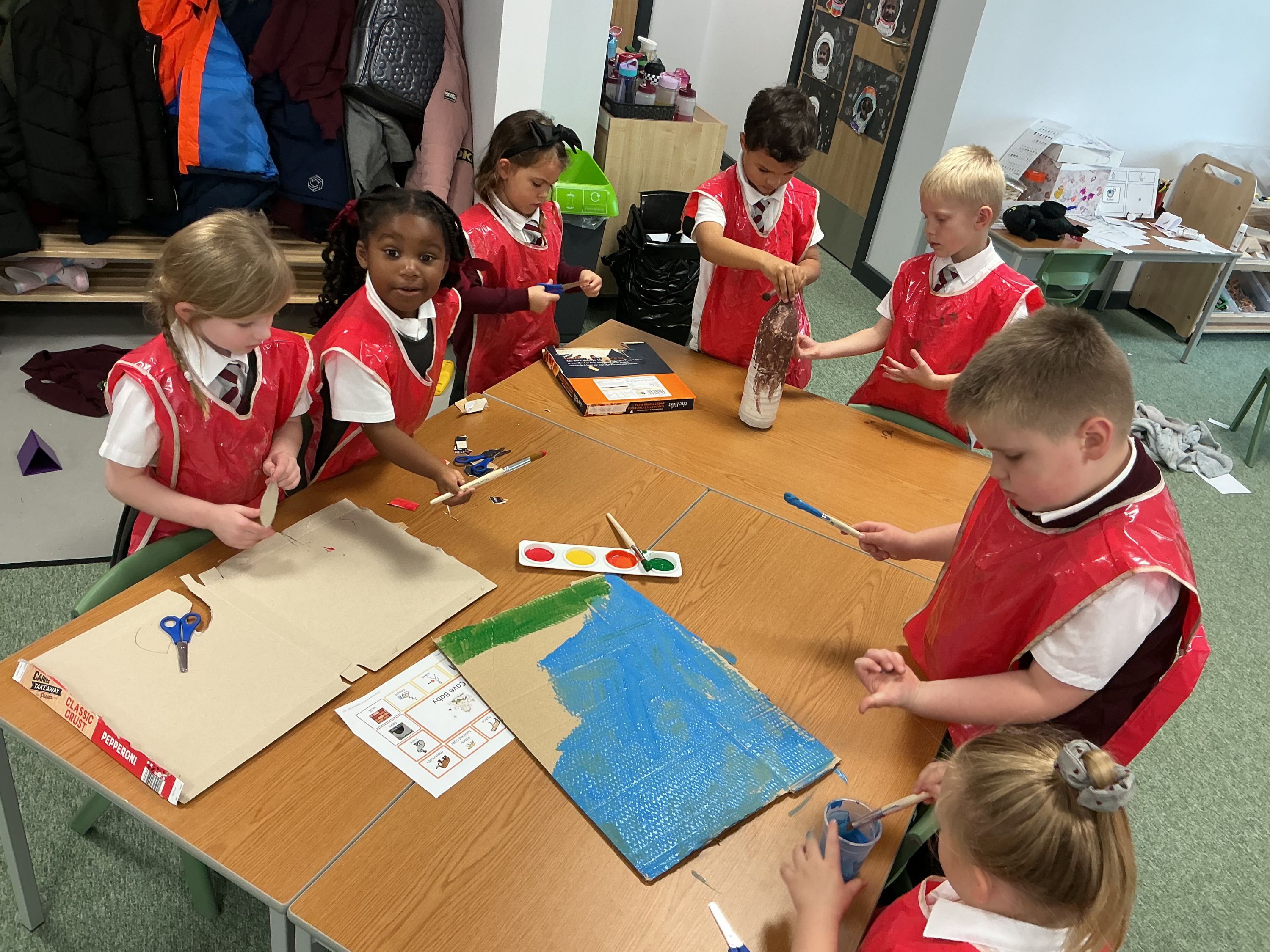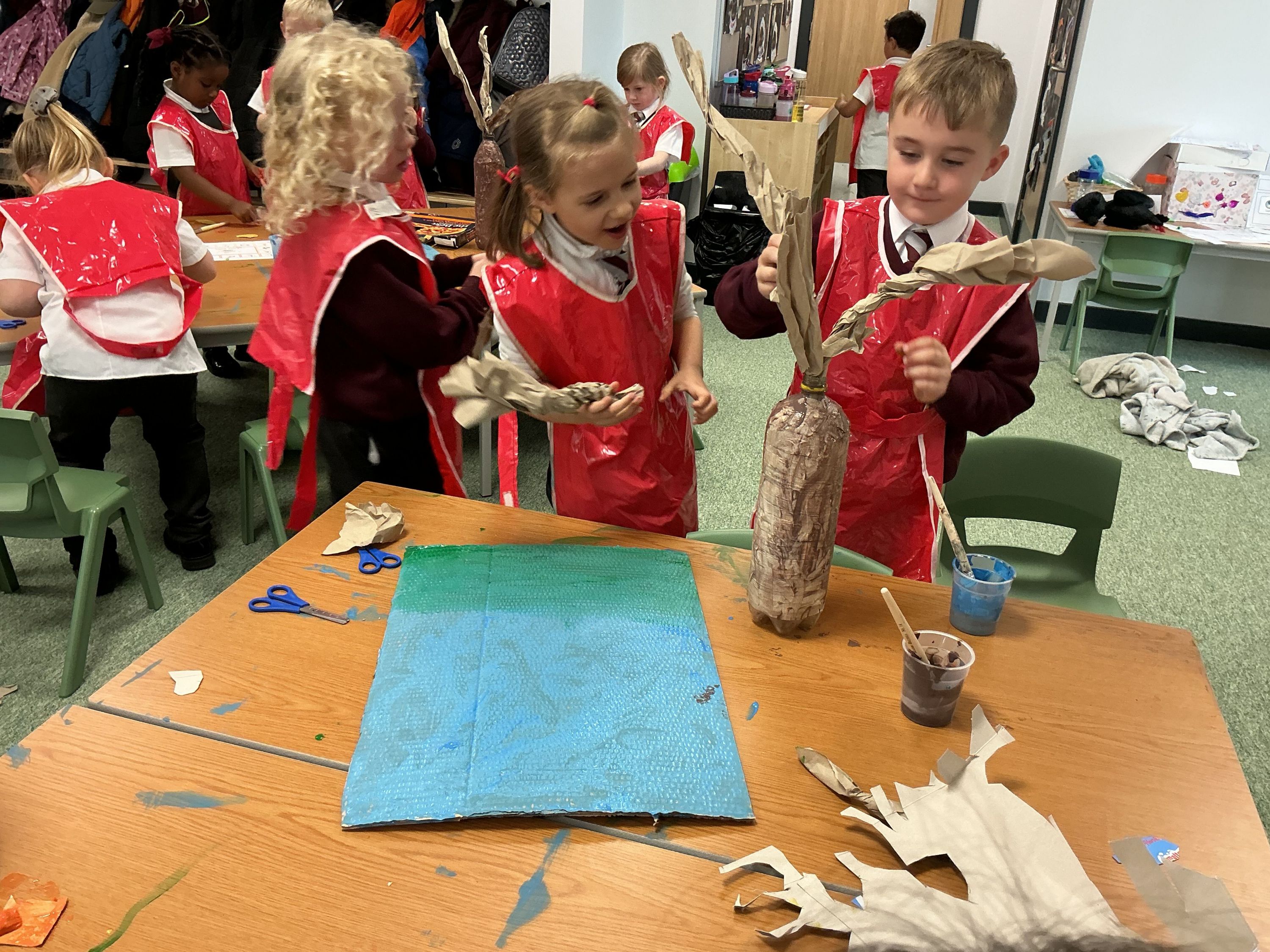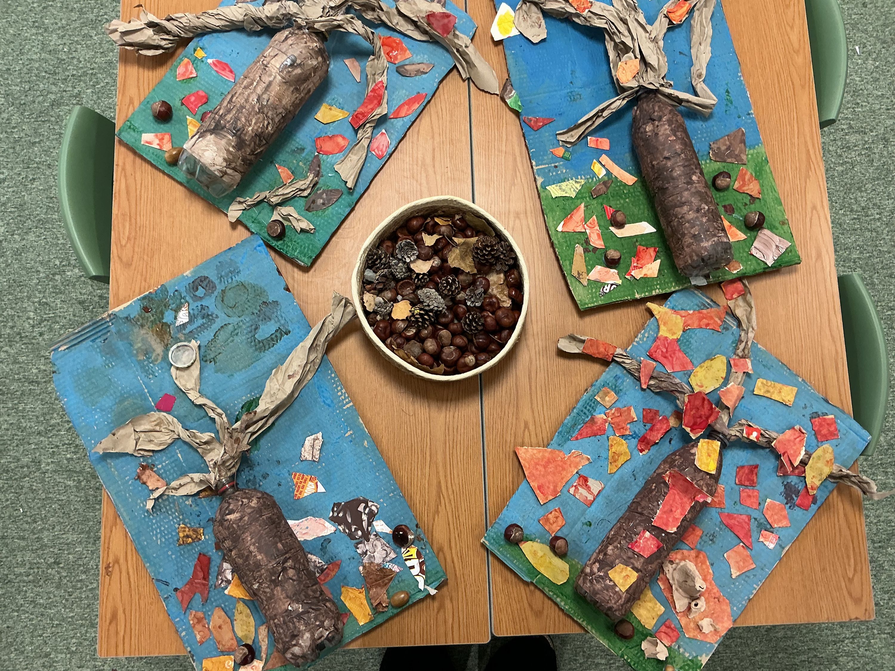 We have also been learning all about Autumn in Science and how things change in this season. We took this as an opportunity to explore our character virtue of co-operating and worked together to create stunning pieces of artwork. The children worked in teams of six or seven and used recycled materials to create an autumn tree. Mrs Stamp and Miss Rogers are so proud of the children because of their teamwork and how well they communicated together.