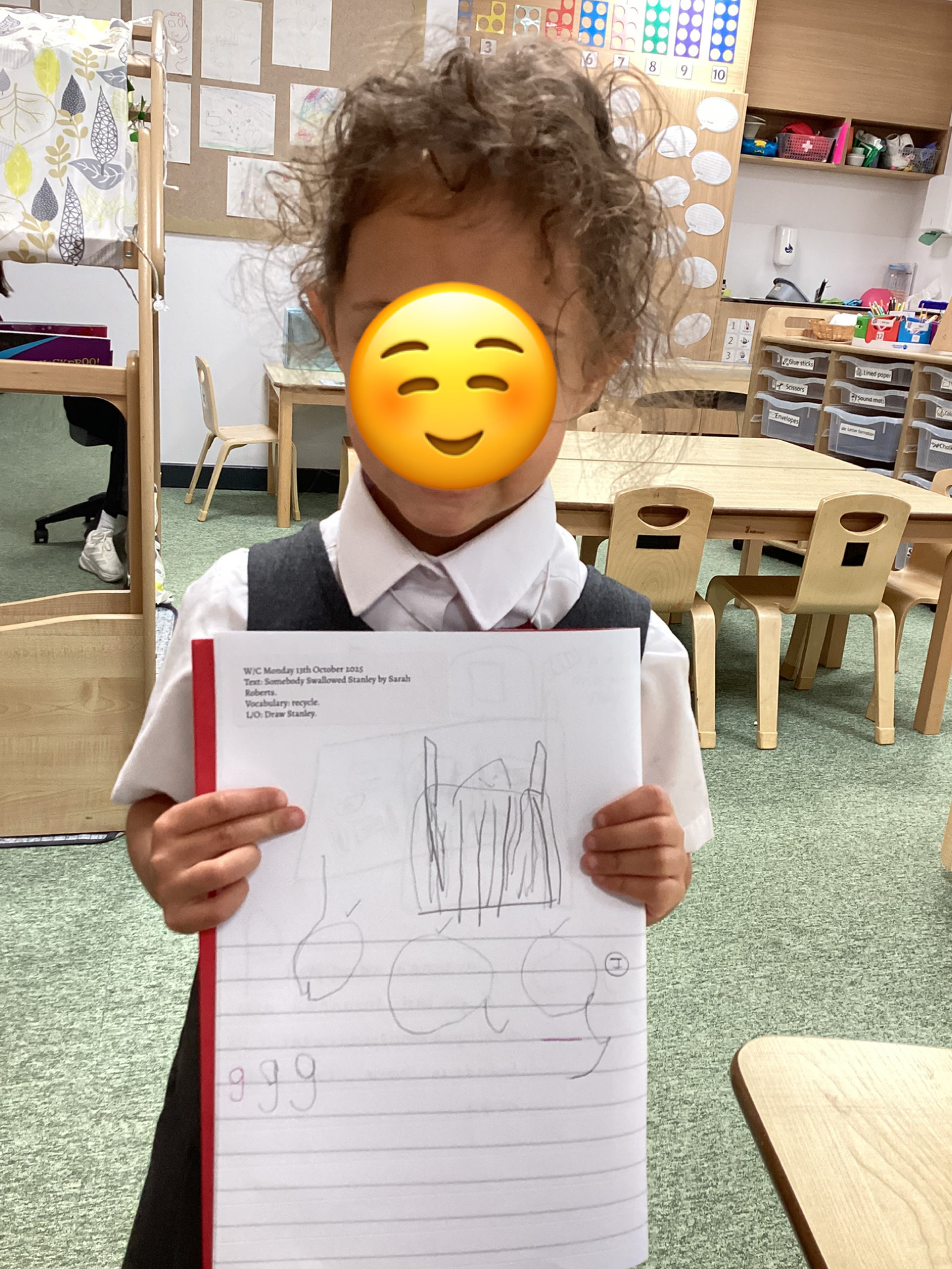 Last week in Drawing Club, we read a book called 'Somebody Swallowed Stanley'. Using the word ‘recycle’, we have learnt why it is important to ensure that we look after our environment properly. We drew Stanley the bag and used out imagination to plan what we would recycle him into if he was our own plastic bag.