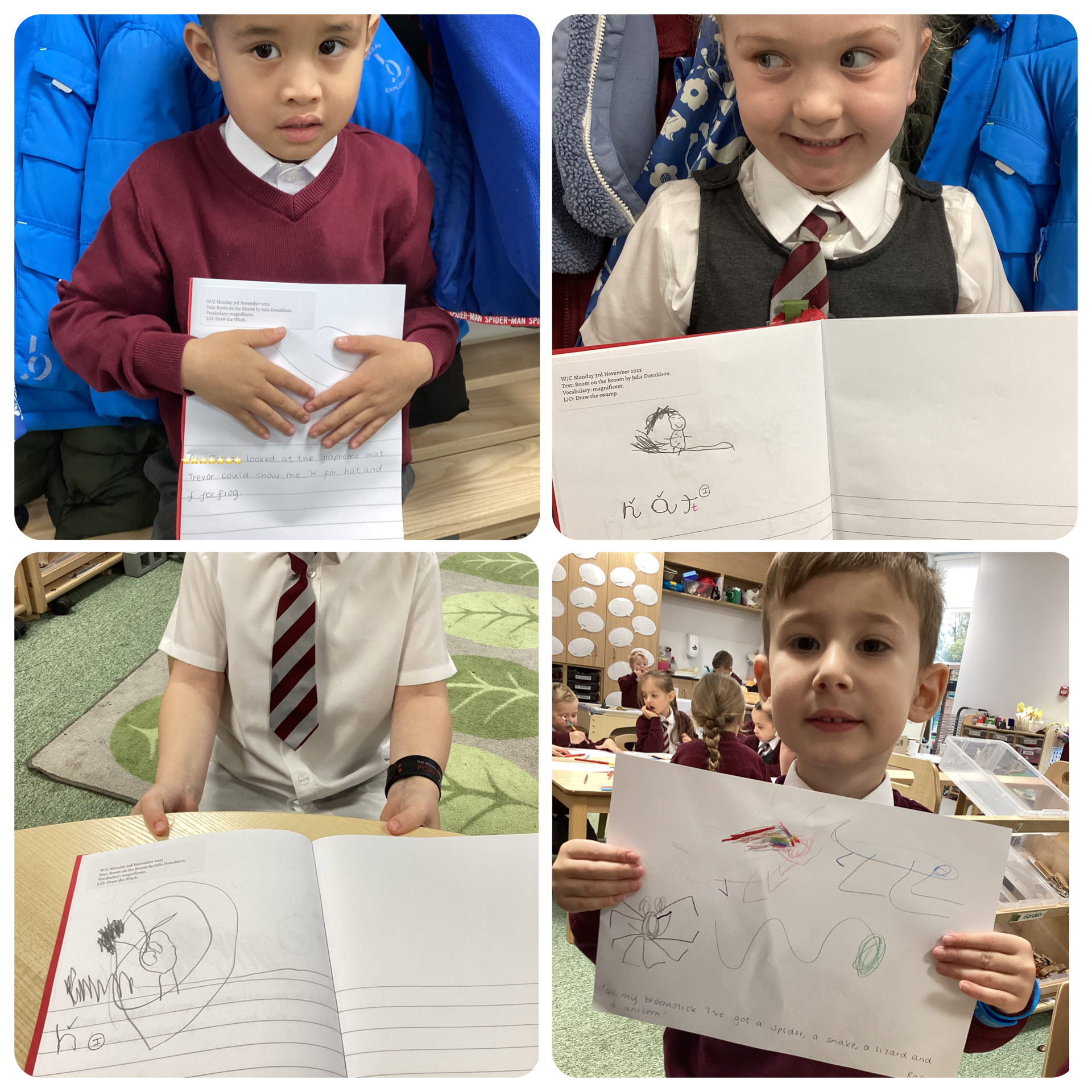This week in Drawing Club, the children used the text 'Room on the Broom'. The children independently applied their phonics to write CVC words such as 'hat'. Some children have even written words such as 'frog and fish'. We are so proud of the children's writing - it is "magnificent!"