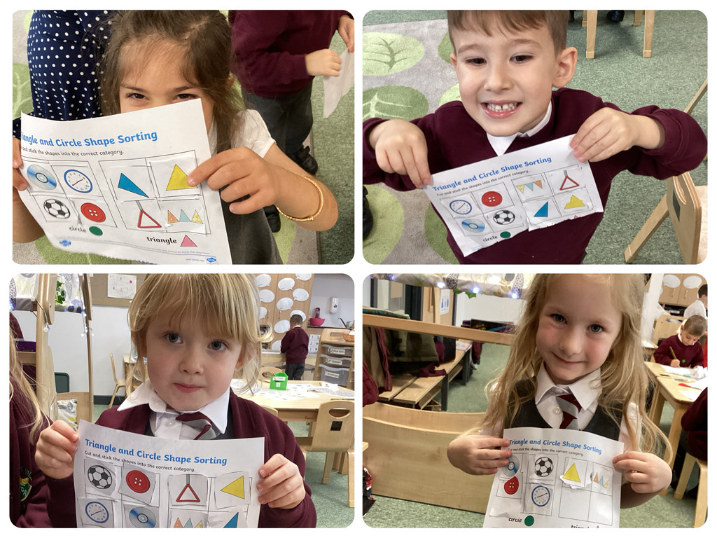 In mathematics, we have been learning about circles and triangles. First, we sorted circles and triangles into sets. We've also enjoyed using our fine motor skills to cut pictures out and stick them in the right group. Then we used our new knowledge and vocabulary about these shapes to imitate the artwork of the famous Russian artist Kandinsky and talk about it. We've also learnt about positional language – we've used a teddy and classroom equipment to show the words under, on top, next to, in between, in front, and behind.