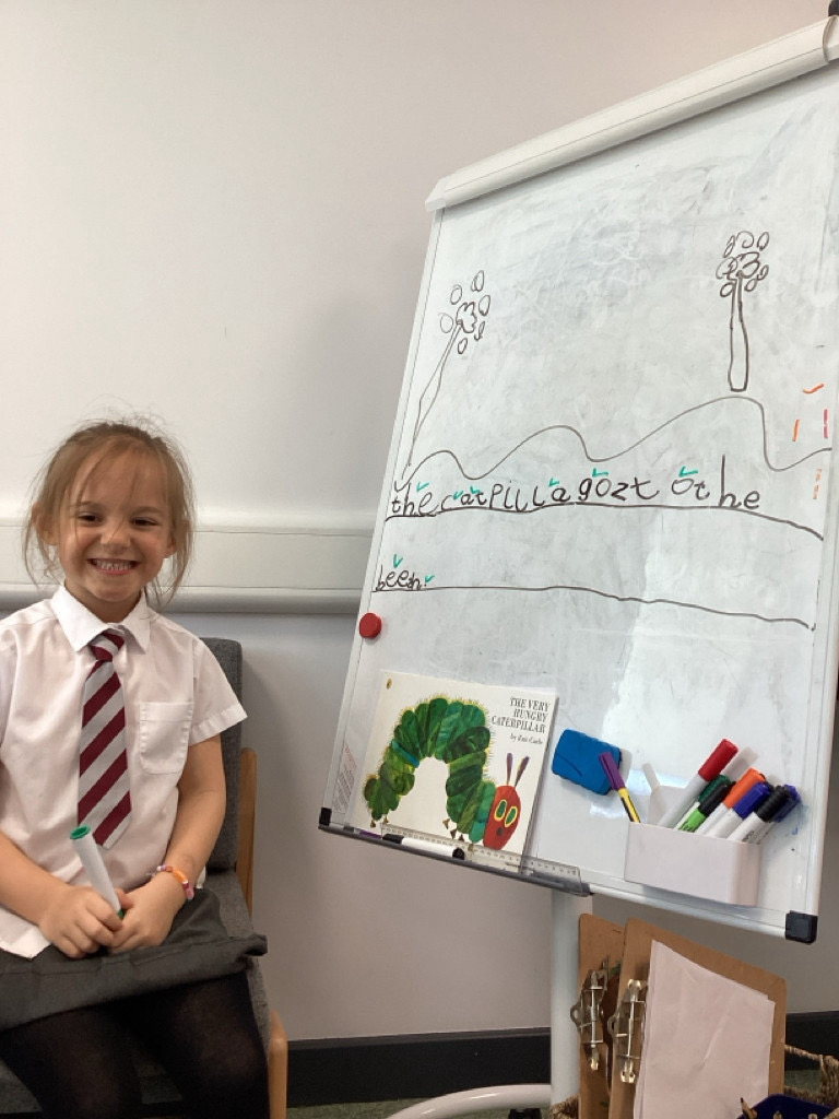 This week, we have read ‘The Very Hungry Caterpillar’. Using the vocabulary ‘munch’, the children have drawn the caterpillar, what the caterpillar will eat, where the chrysalis is hanging, and where the butterfly will fly to.